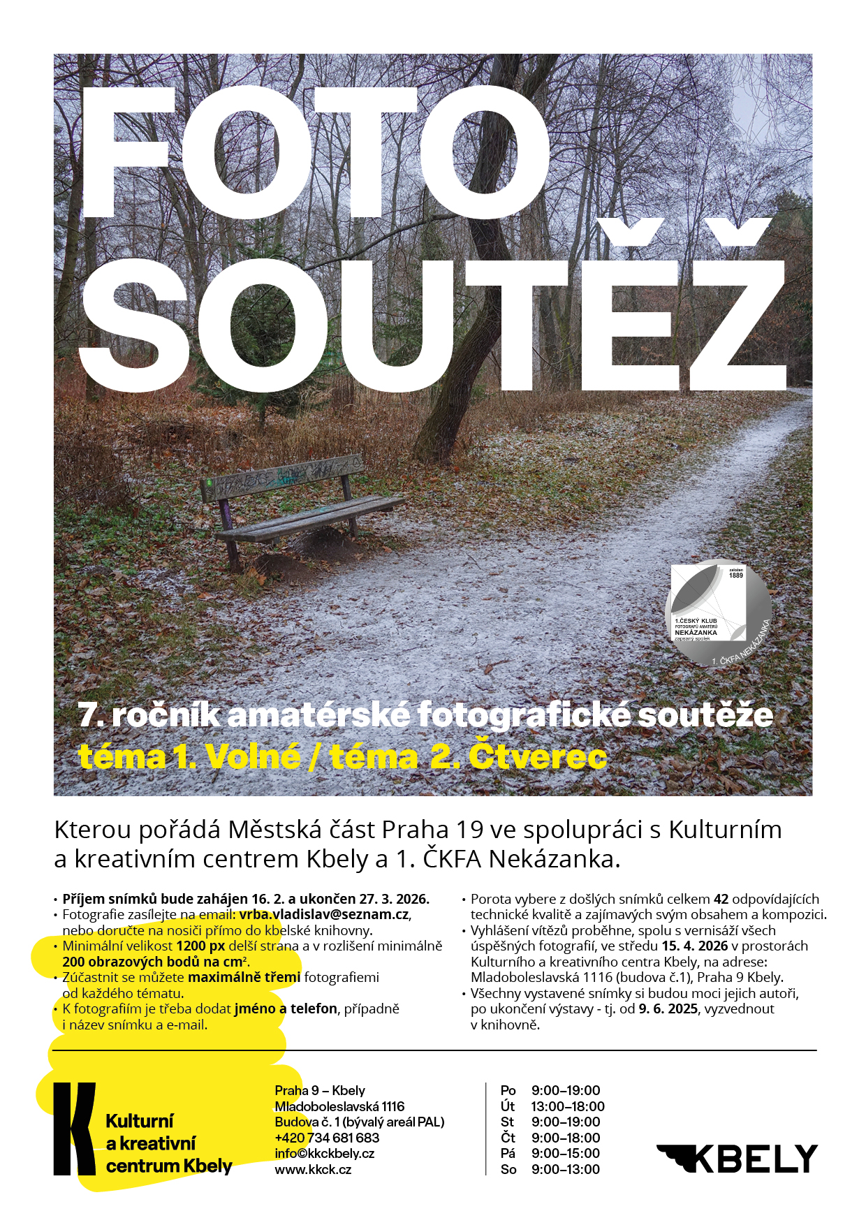 Vyhlášení vítězů proběhne, spolu s vernisáží všech úspěšných fotografií, ve středu 15. 4. 2026 v prostorách Kulturního a kreativního centra Kbely, na adrese: Mladoboleslavská 1116 (budova č. 1), Praha 9 – Kbely.