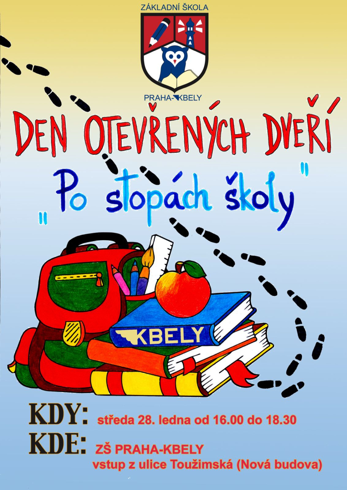 Jeho podtitul zní „Po stopách školy“ a právě stopy vás zavedou k různým aktivitám, díky nimž si budete moci udělat obrázek o naší škole. Na jednotlivých stanovištích se vás ujmou naši žáci, hovořit budete moci i s učiteli a s vedením školy. Průvodci vám budou naši nejstarší žáci a žákyně z devátých tříd. Ti budou podávat úvodní informace při vstupu a pomůžou vám, pokud byste potřebovali najít správný směr.