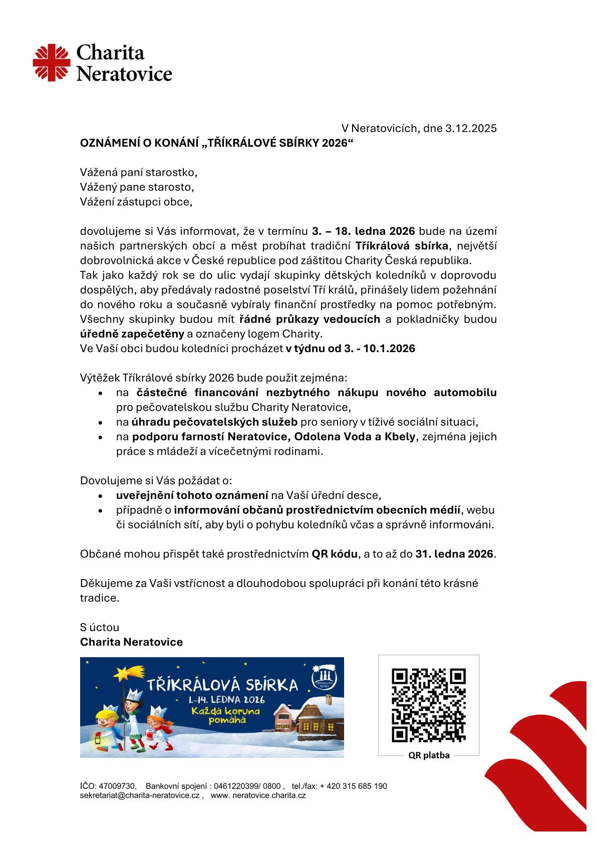 dovolujeme si Vás informovat, že v termínu 3. – 18. ledna 2026 bude na území našich partnerských obcí a měst probíhat tradiční Tříkrálová sbírka, největší dobrovolnická akce v České republice pod záštitou Charity Česká republika.